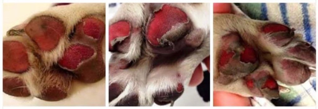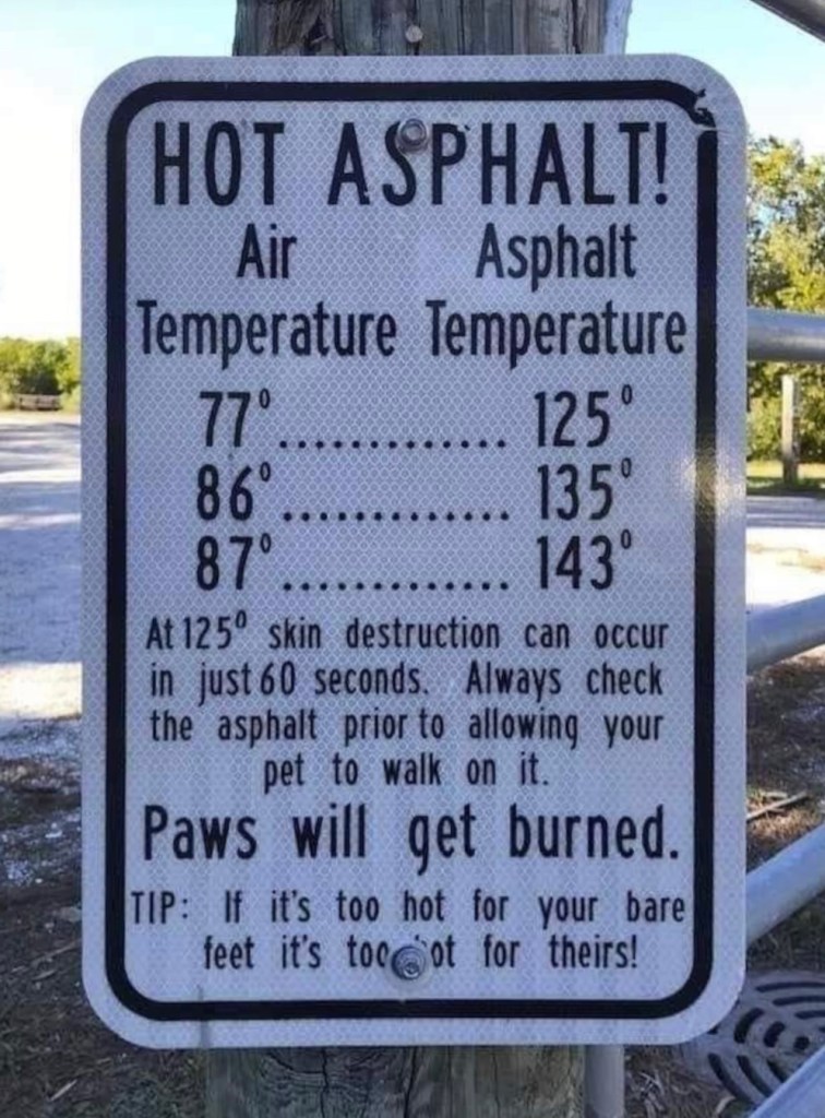 Asphalt gets hot, paws get burnt. It only takes a couple minutes to damage the pads on a dog’s paws. Look at the photo above as reference.